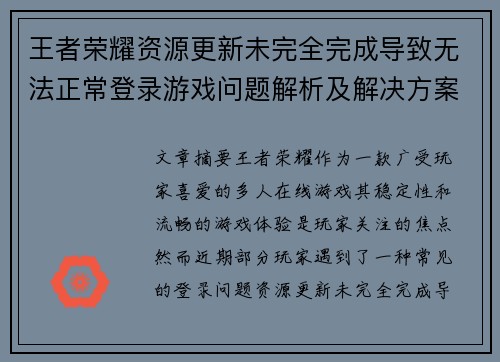 王者荣耀资源更新未完全完成导致无法正常登录游戏问题解析及解决方案