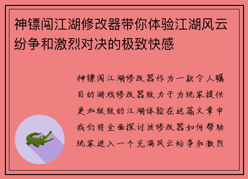 神镖闯江湖修改器带你体验江湖风云纷争和激烈对决的极致快感